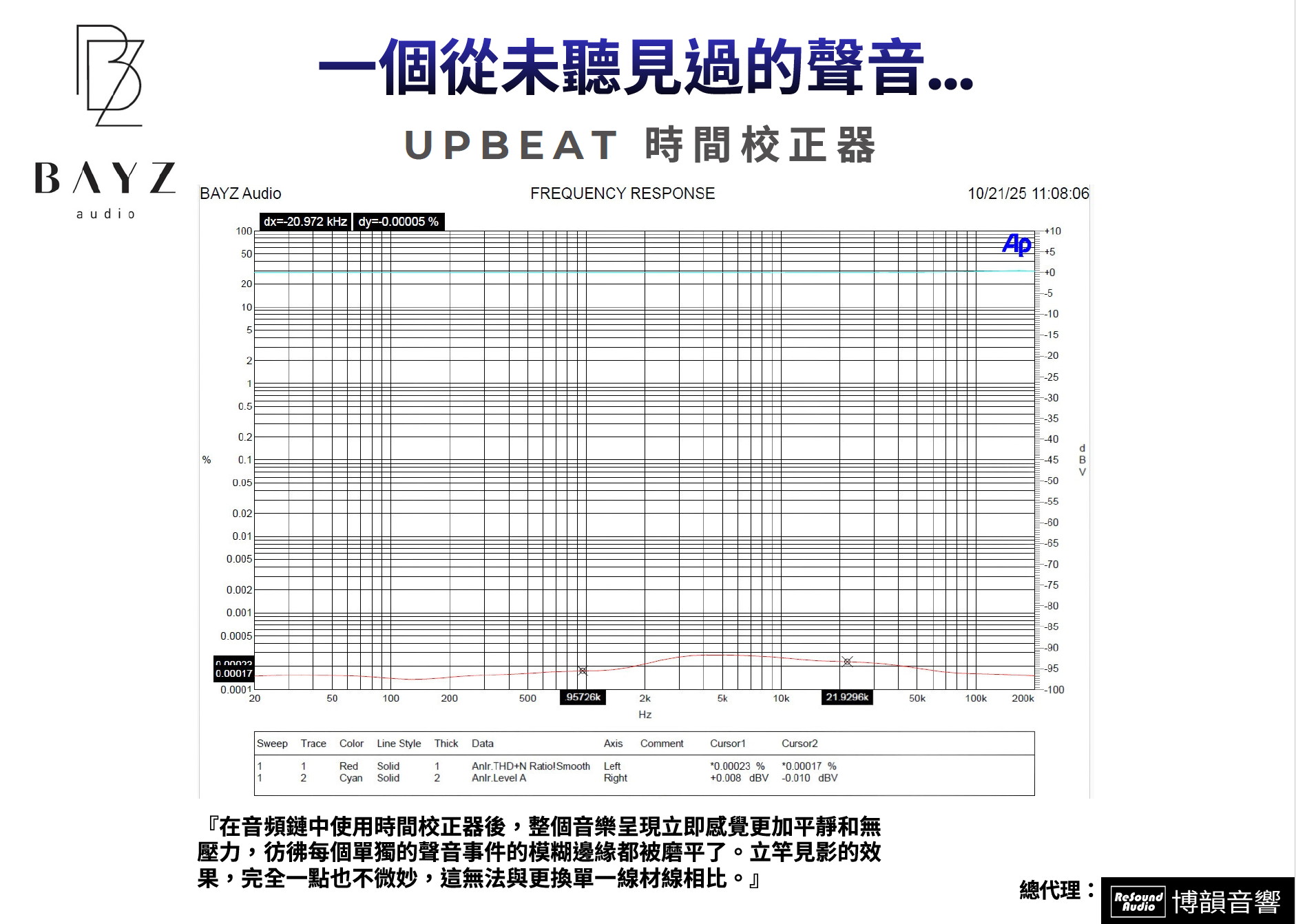Upbeat 時間校正器是⼀個完全被動的裝置 — 內部沒有主動電⼦元件、擴⼤器或濾波器。透過微觀能量補償與時域矯正,它恢復了信號傳輸過程中丟失的⾃然時間平衡。實驗室測量顯示頻率響應或失真毫無變化 — 然⽽,當它被置於系統中時,每⼀個聲⾳都回到了它⾃然的位置。其結果是恢復了類比的時間線性 — 這是⼀種⼈耳⾼度敏感的時間精準度。這種時域矯正並非“改善”⾳質,⽽是恢復信號流的⾃然節奏,消除了導線、連接器及介質交互所引入的微⼩充放電延遲。