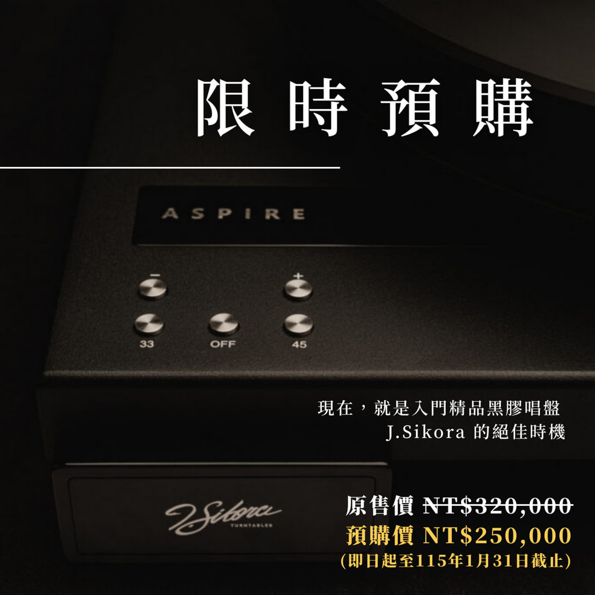 J.Sikora 全新入門旗艦 ASPIRE 黑膠唱盤台灣首發 —— 開放限時預購、超值套裝同步登場!波蘭精品黑膠品牌 J.Sikora 宣布旗下全新入門級旗艦 ASPIRE 黑膠轉盤 正式抵台。ASPIRE 以濃縮版的高階技術、精準的機械性能與極高的隔振能力,成為許多類比玩家期待已久的「進入 J.Sikora 世界」最佳起點。