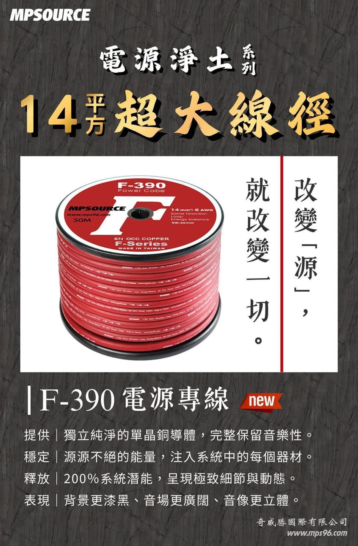 好的系統就要從根本電源之傳輸處理,台灣High End線材大廠奇威勝深知電源專線之重要,自有線材品牌MPSOURCE特別推出F-390/F-360兩款電源專線,使用6N OCC單結晶銅為導體,運用MPSOURCE全正相位,循序走向,能量平衡三項獨家核心技術!